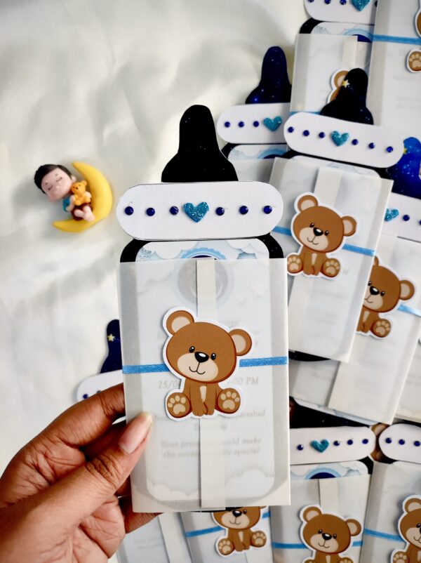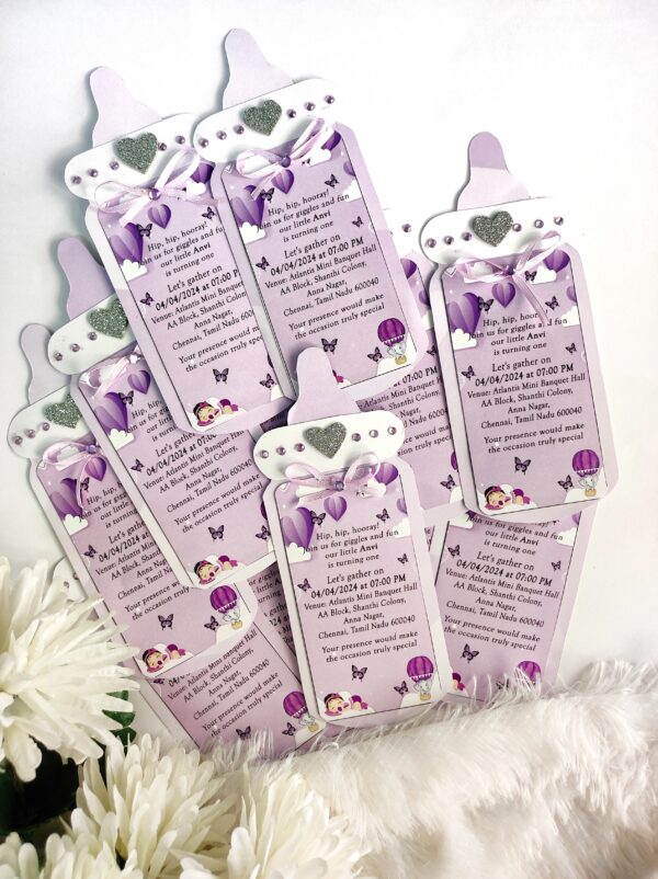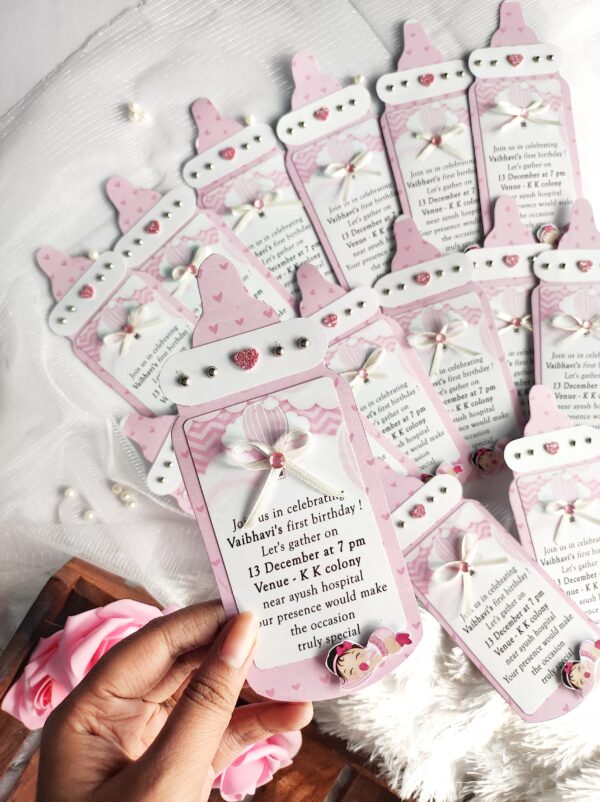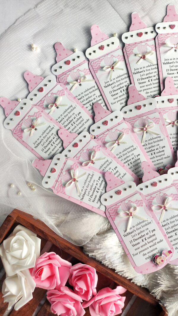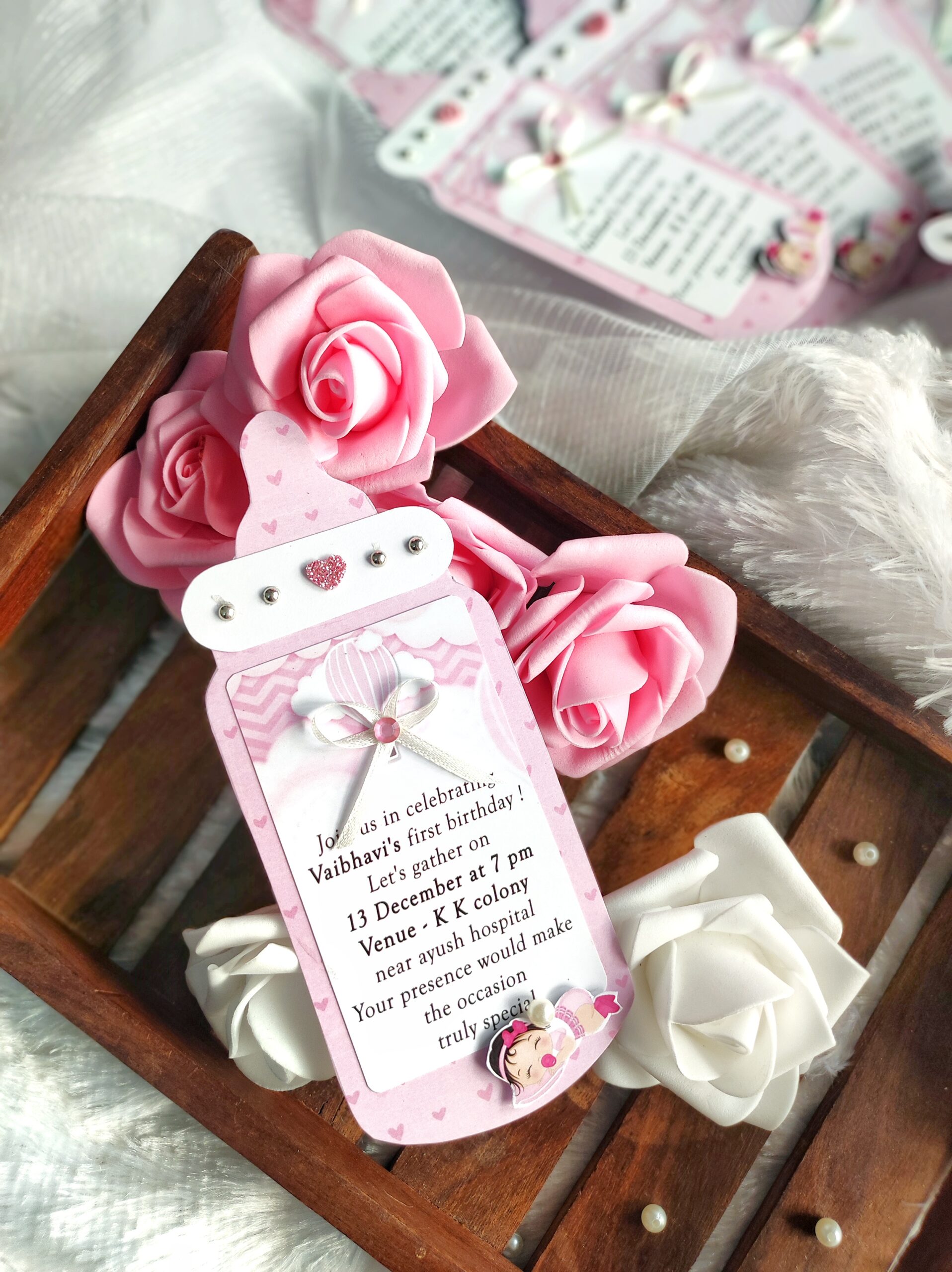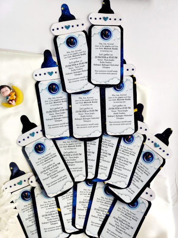 Celebrate special occasions with our handcrafted baby bottle–shaped invitation cards designed with love and creativity. Perfect for birthdays, baby showers, or naming ceremonies, these unique invites add a personalized and charming touch to your event